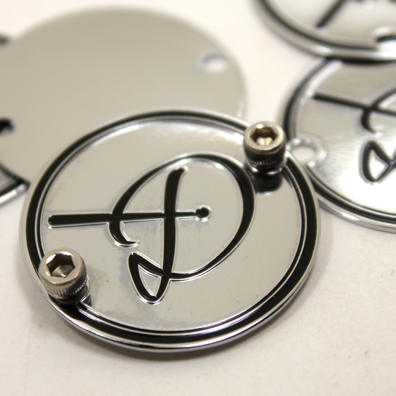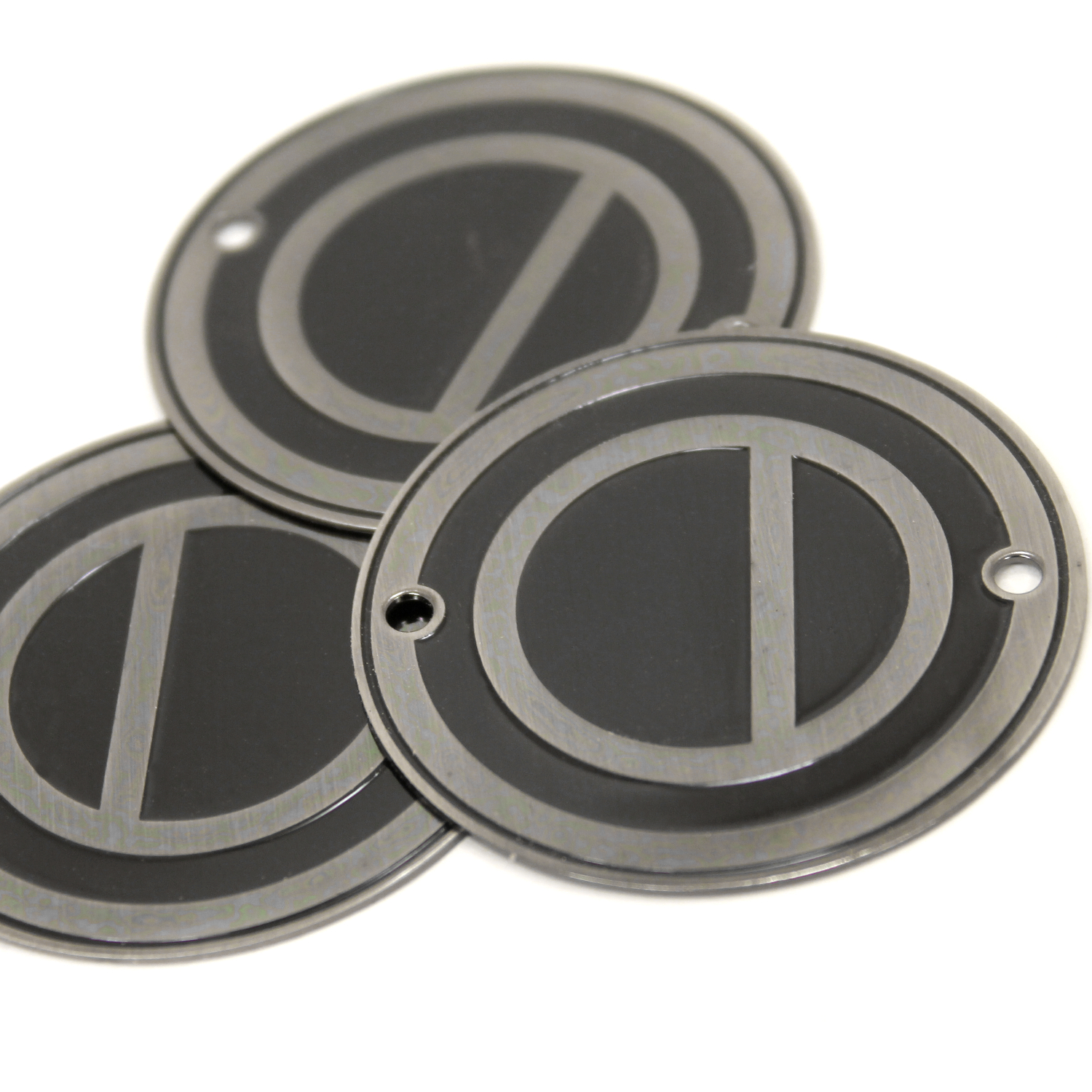 Etched badges attach to the drum using either screws or an air vent. Include the screw hole or vent hole size and placement on your design.