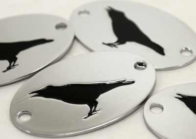 For example, if you want an outer graphic element or text to be enameled, that means those objects have to be recessed and you will need a raised metal border around them. If you want the space around these objects to be enameled, then that means the text or other graphic elements would have to be raised.